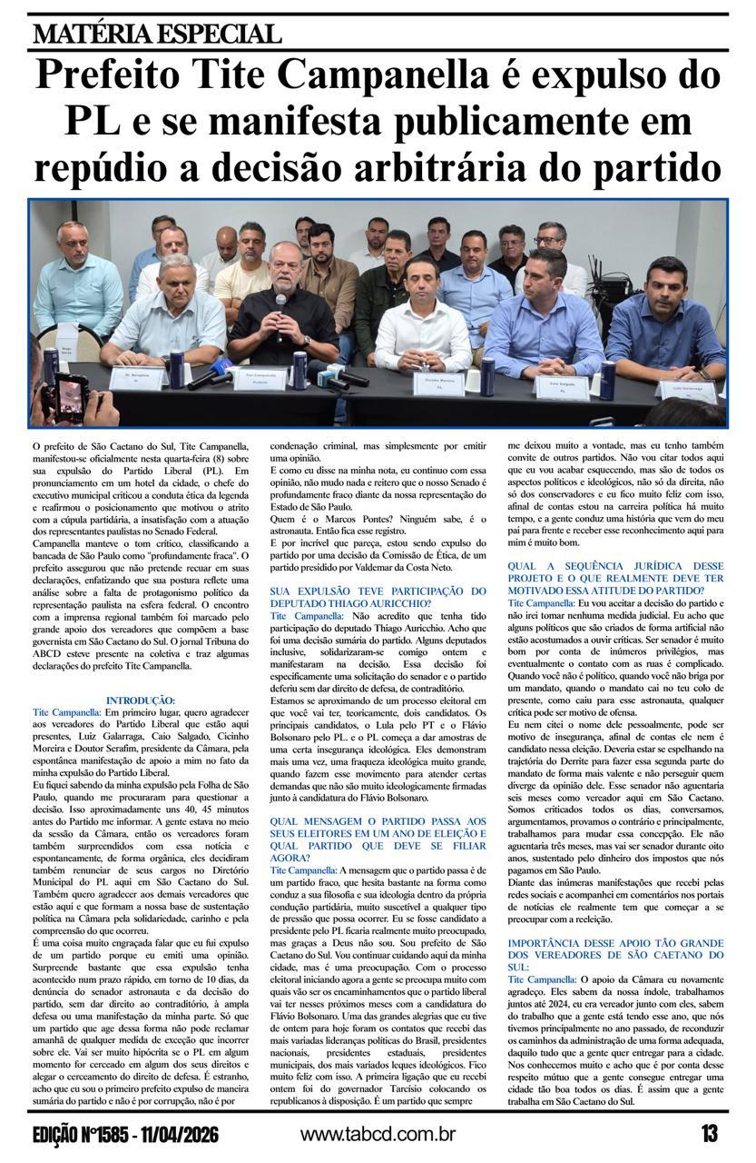 Prefeito de São Caetano, Tite Campanella, é expulso do PL após críticas a senadores — decisão gerou forte repercussão política.